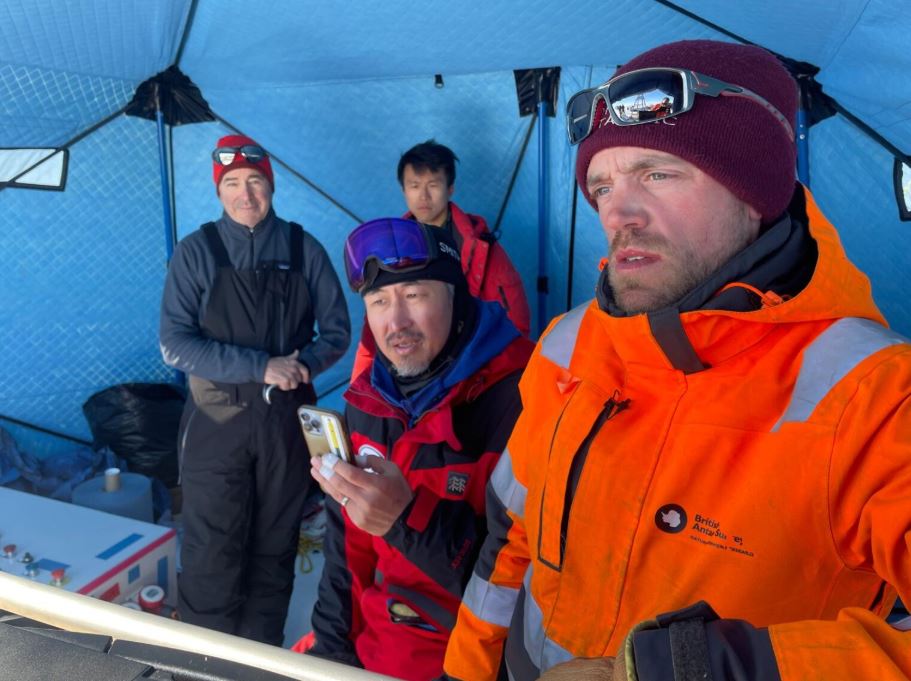 El equipo de BAS y KOPRI espera noticias de los sensores instalados en el pozo del glaciar Thwaites. Crédito de imagen: Pete Davis, BAS