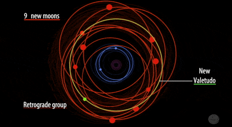 Las demás 10 lunas pertenecen al grupo más alejado, denominado retrógrado (como se indica en anterior animación), es decir que orbitan en dirección opuesta a la rotación del planeta. Nueve de estas lunas orbitan de forma retrógrada, pero una de ellas es muy extraña y orbita en progrado. A esta última luna le toma más tiempo completar una órbita, a diferencia de las demás, siendo de 1.5 años.