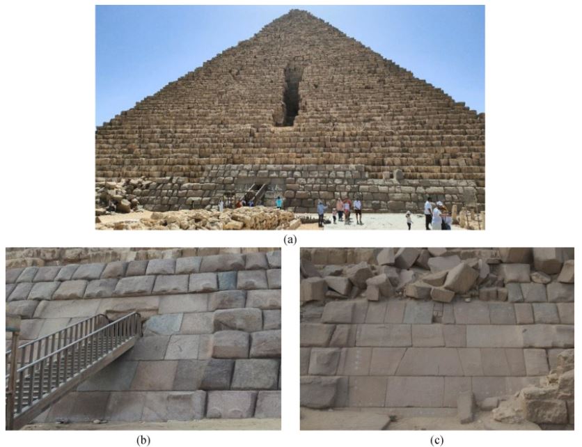 (a) La cara norte de la pirámide de Menkaure y (b) una vista cercana de la entrada principal, y (c) la parte pulida de la cara este (objeto de interés en este estudio). Crédito de imagen: NDT & E International