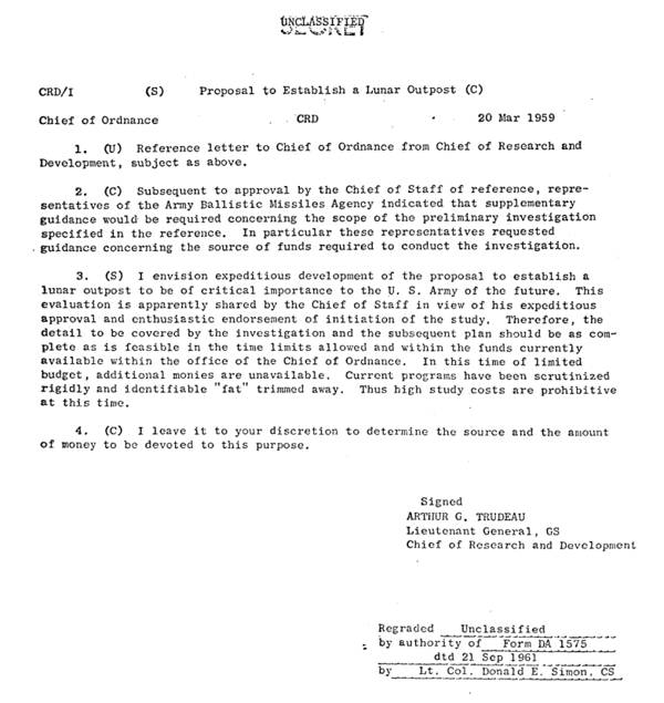 El 9 de junio de 1959, el Gobierno de los Estados Unidos decidió que la construcción de una base en la Luna era de gran importancia para el país.