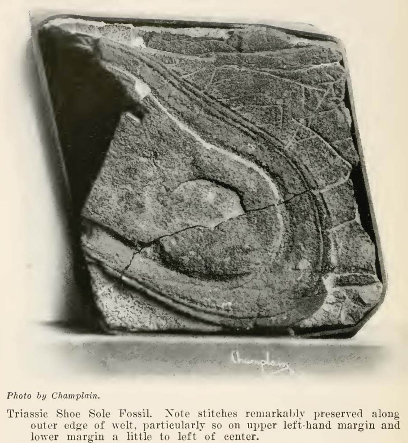 Al descender la colina mi atención fue atraída por el fósil. Este se encontraba entre algunas rocas sueltas. Lo recogí y lo guardé en el bolsillo para examinarlo más a fondo. Un examen llegó a la conclusión de que se trataba de una capa de la suela de un zapato que se había desprendido por succión; permaneciendo en la roca en estado plástico en ese momento. Lo encontré en una piedra caliza del periodo Triásico, en un territorio que atraviesa esa sección de las colinas.”