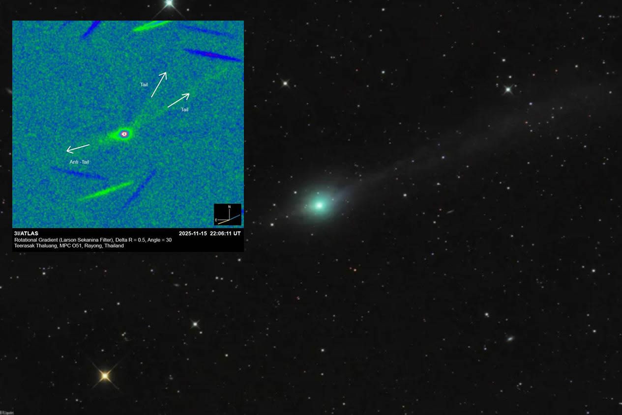 Imagen de 3I/ATLAS el 14 de noviembre de 2025. Crédito de imagen: Rolando Ligustri. En el recuadro de la izquierda: imagen de 3I/ATLAS, tomada el 15 de noviembre de 2025, muestra una anticola prominente junto con dos colas. La dirección hacia el Sol apunta a la esquina inferior izquierda. Crédito de imagen: Teerasak Thaluang, MPC-051, Rayong, Tailandia.