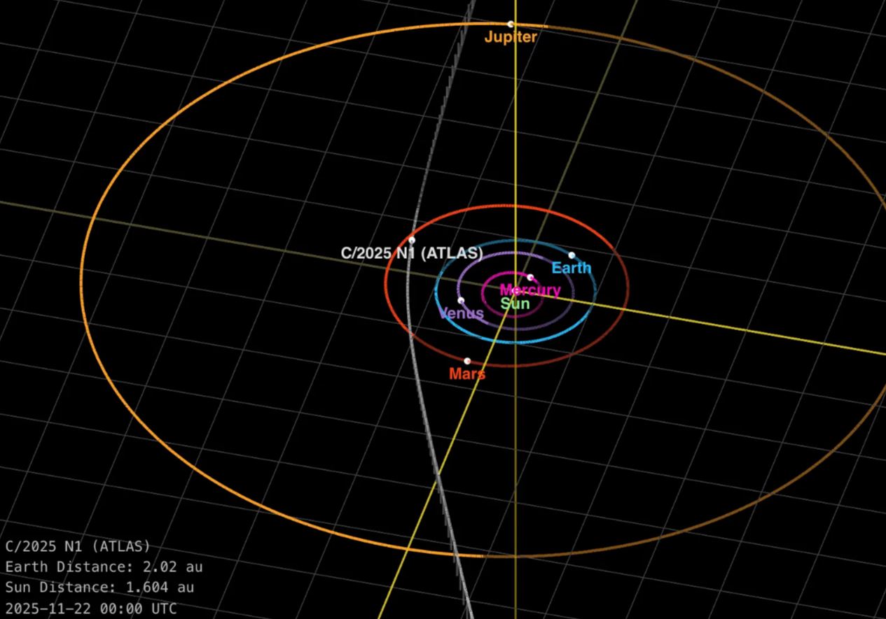 Trayectoria de 3I/ATLAS con posiciones de los planetas el 22 de noviembre de 2025. Crédito de imagen: NASA / JPL